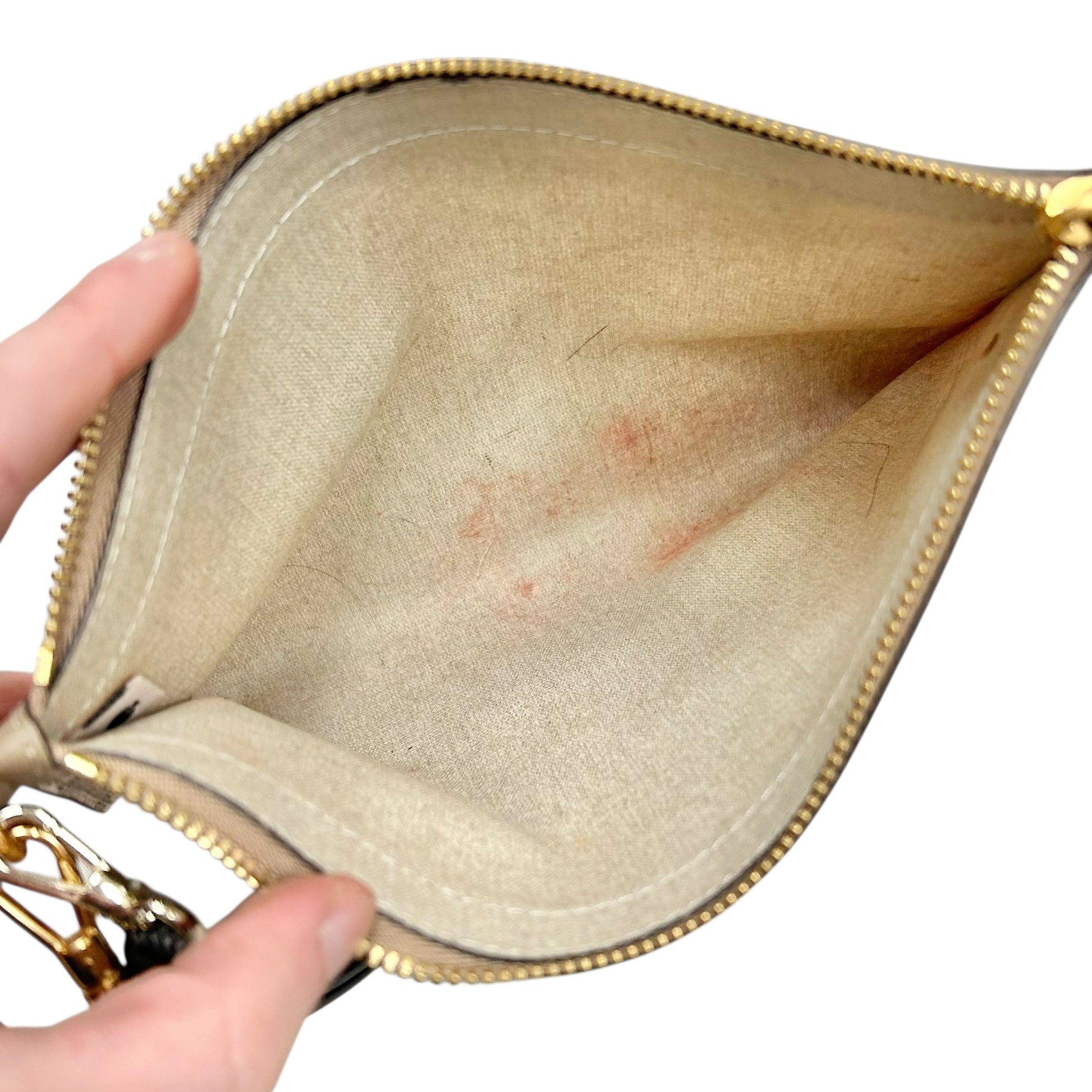 Other Info: SLIGHT EXTERIOR STAINING ON TOTE/STAINING INTERIOR OF POUCH