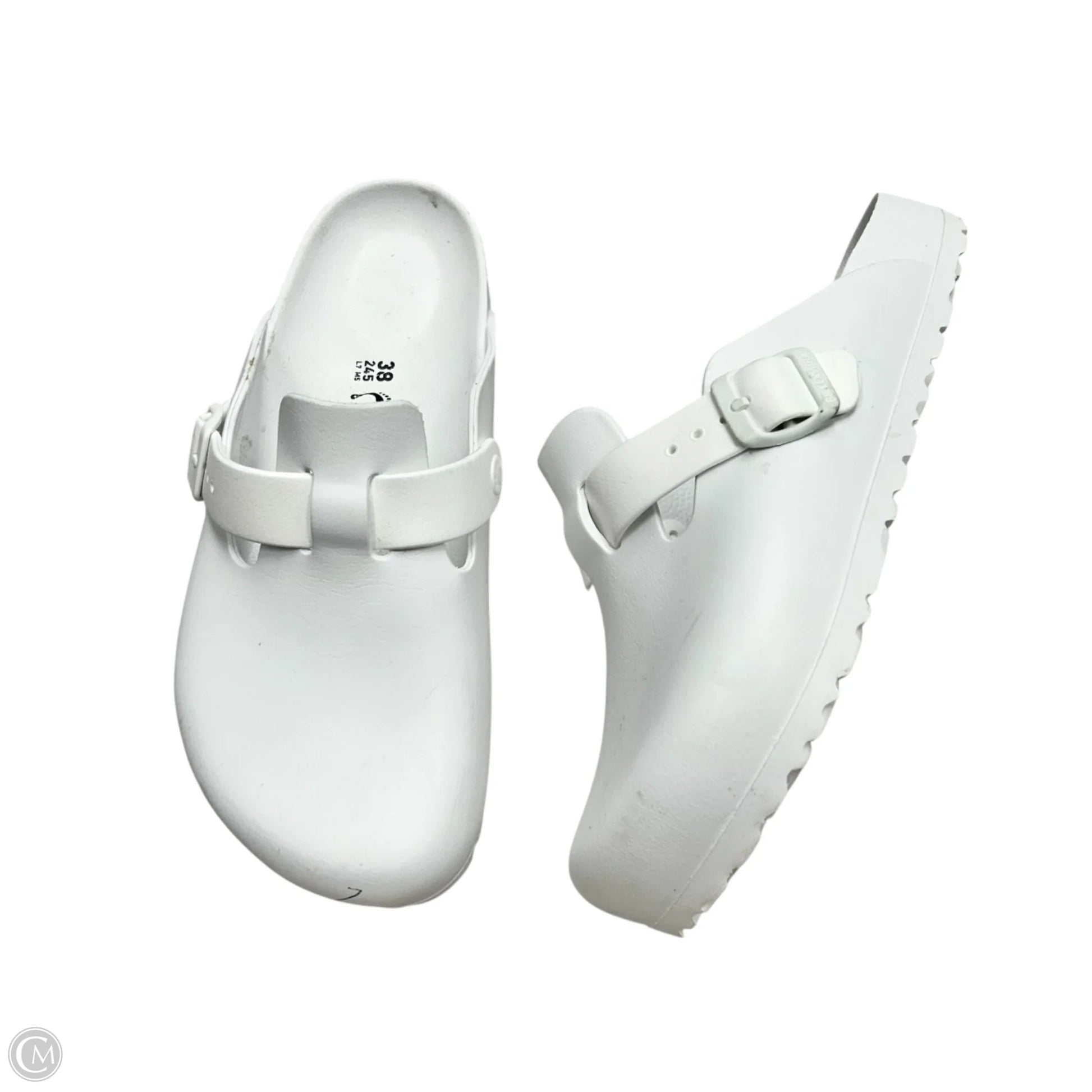 Step out in style with these sleek white Birkenstock sandals in size 7.5. Embrace comfort and chic simplicity effortlessly.